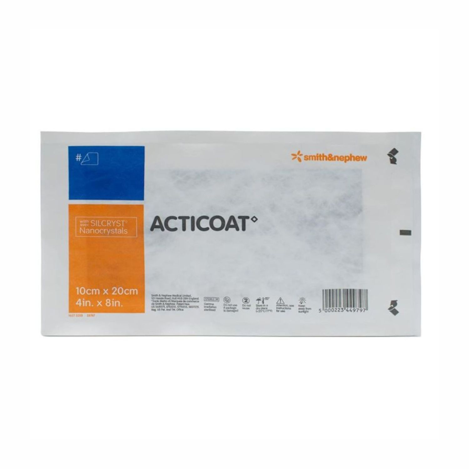 EL APÓSITO ACTICOAT COMPUESTO POR PLATA NANOCRISTALINA, ES UNA BARRERA ANTIMICROBIANA , CON LIBERACIÓN SOSTENIDA DE PLATA HASTA POR 72 HORAS (3 DÍAS). CUENTA CON 2 CAPAS EXTERNAS DE POLIETILENO DE ALTA DENSIDAD CUBIERTAS CON PLATA.