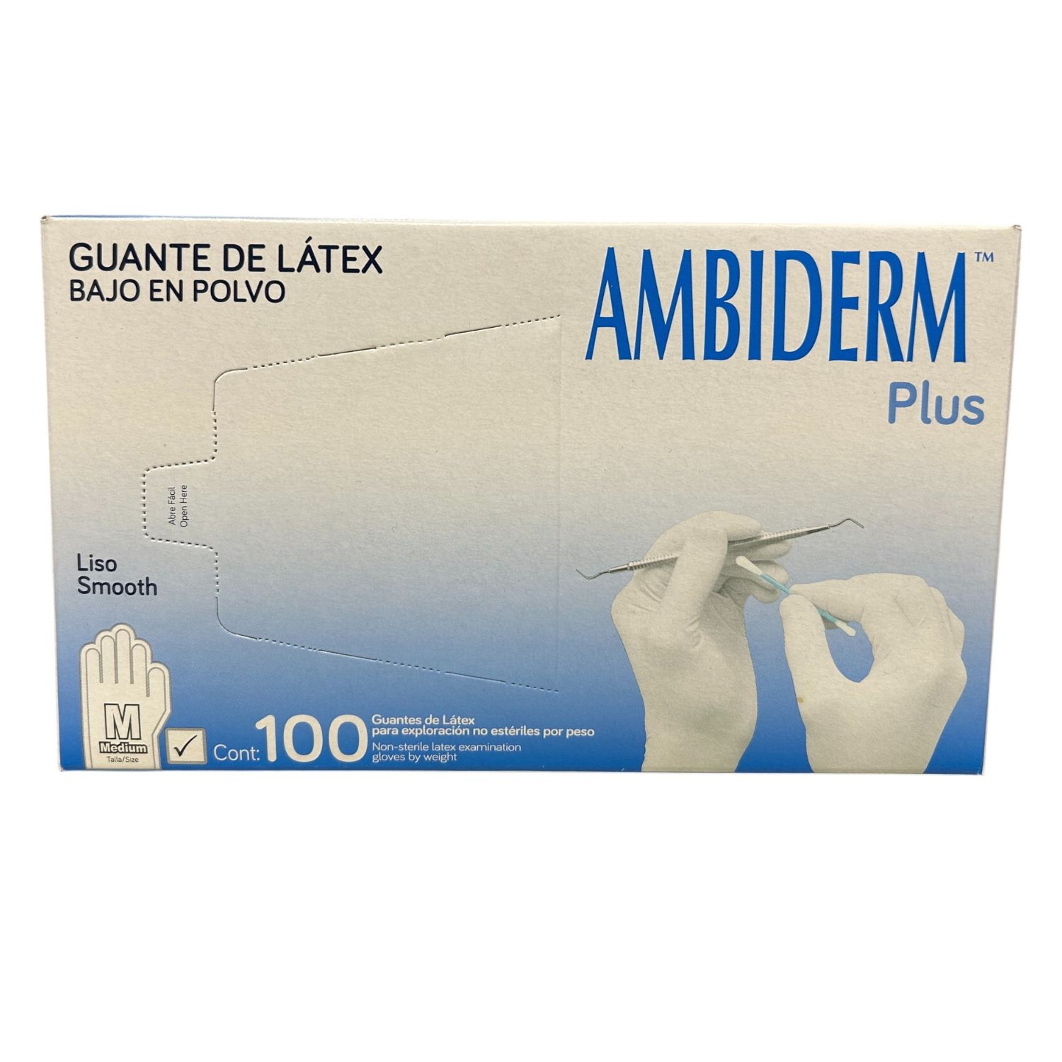 GUANTES DE LÁTEX NO ESTÉRIL AMBIDERM® PLUS COLOR BLANCO DE TALLA MEDIANO, ELABORADA CON UNA TEXTURA LISA, SU DISEÑO ES AMBIDIESTRO PARA UN AJUSTE PERFECTO Y CONFORTABLE. LOS GUANTES SON IDEALES PARA EXPLORACIÓN Y DE USO MEDICO, ES DESECHABLE Y NO ES ESTÉRIL.