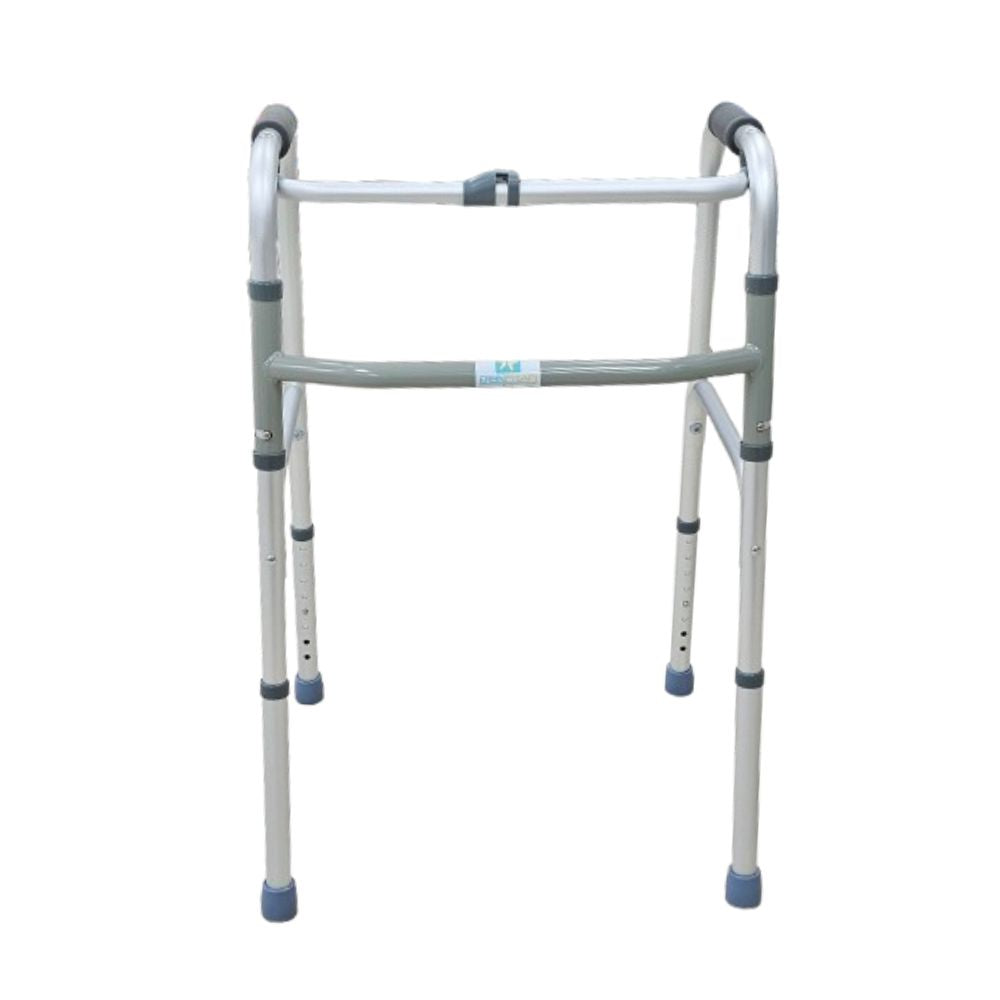 Andadera para adulto mayor con soporte de aluminio, cuenta con con un solo botón que permite plegarse fácil y rápidamente además de que tiene refuerzo transversal está ubicado cerca de las empuńaduras para que se puedan dar pasos largos.